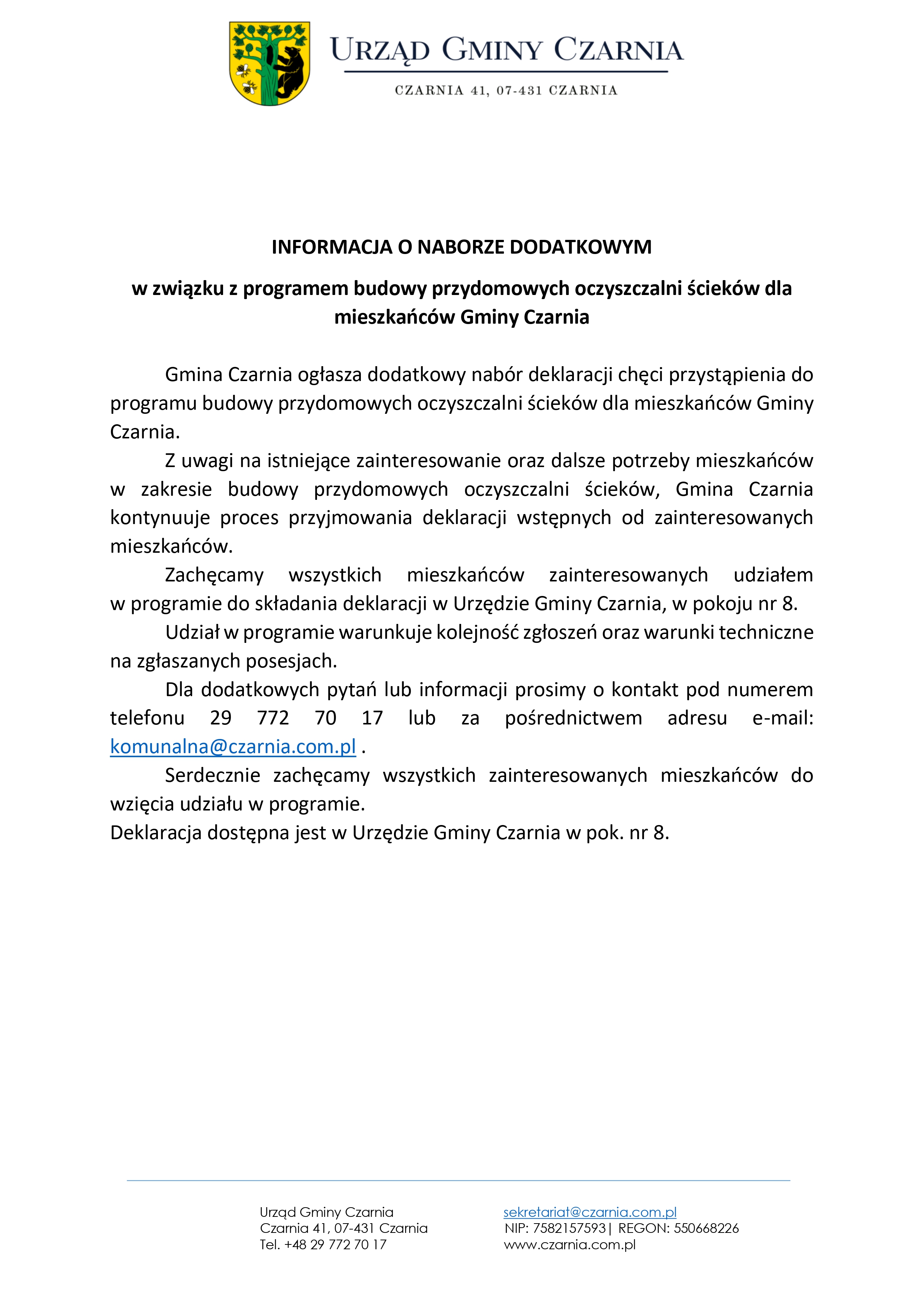 Informacja o naborze dodatkowym w związku z programem budowy przydomowych oczyszczalni ścieków dla mieszkańców Gminy Czarnia