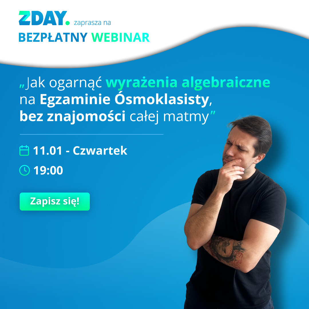 Jak oceniasz swój poziom wiedzy na temat wyrażeń algebraicznych? Umiesz je rozwiązywać? A może już na samą myśl o nich zaczynasz się stresować? Nie martw się! Istnieją sposoby, aby sobie z nimi poradzić! Przedstawi je Karol Wilczyński, nauczyciel i korepetytor z dużym doświadczeniem. Kiedy? Na bezpłatnym webinarze, w ten czwartek, 11.01.2024 r.. Warto przyjść, żeby dowiedzieć się, jak ogarnąć wyrażenia algebraiczne na Egzaminie Ósmoklasisty bez znajomości całej matmy.